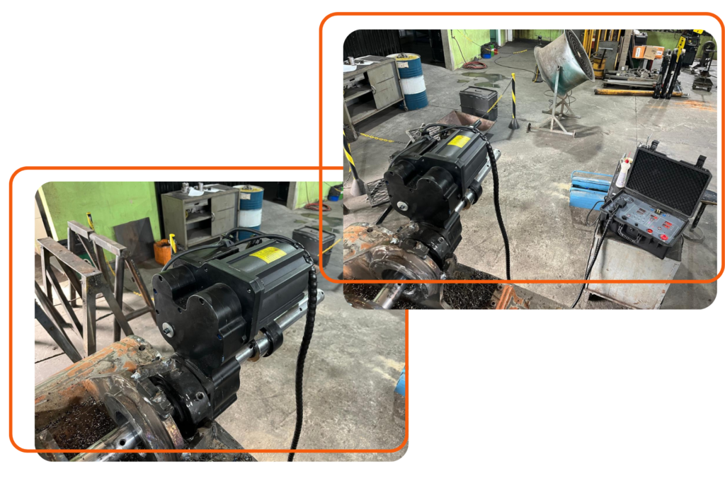 Operação de mandrilamento realizada diretamente em campo, garantindo precisão e redução de tempo de parada de equipamentos.